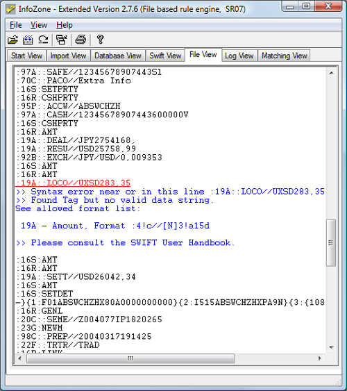 Messages are checked against the defined syntax. In case of a syntax error you can jump direct to the error within the original message. Semantic checks can be added by us if needed. Please contact us for more information.