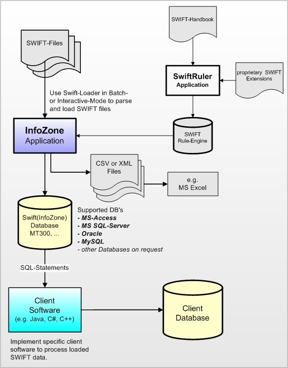 In a first step we invested a lot of time and knowledge to build up an automatic Rule Generator. This generator parses the message user handbook and generates rule files for all the message types.InfoZone's heart is a fast, rule based Message Parser. Messages are loaded and saved in a structured way to allow efficient presentation and fast data processing. Data export to flat file and XML is also supported.